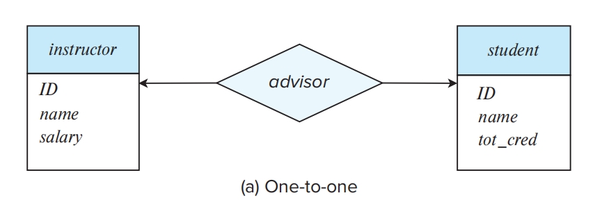 In the E-R diagram notation, we indicate cardinality constraints on a relationship by drawing either a directed line (\(\rightarrow\)) or an undirected line (—) between the relationship set and the entity set in question.