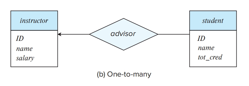 - 一对多(one-to-many)。我们从联系集到联系的"一"侧画一条有向线段。