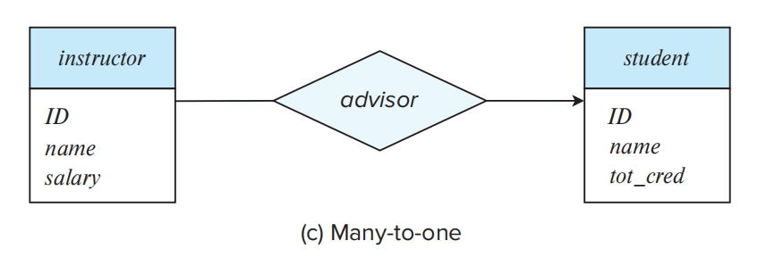 对于一对多和多对一关系,"多"方的主码是最小的超码,并被用作主码。例如,如果从 student 到 instructor 的联系是多对一的,即每名学生最多只能有一位导师,则 advisor 的主码就仅是 student 的主码。
