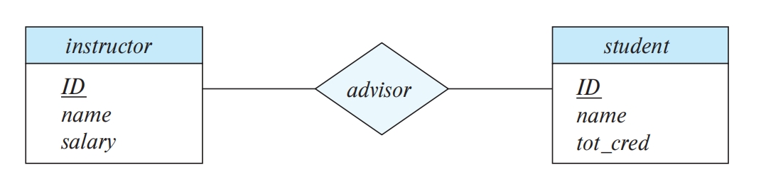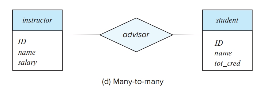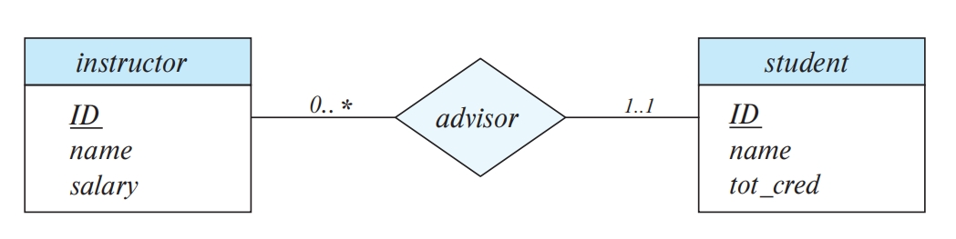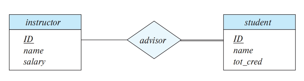 的限制,说明一位教师可以有零名或多名学生。因此,advisor 联系是从 insiructor 到 student 的一对多联系,更进一步地讲,student 在 advisor 中的参与是全部的这意味着一名学生必须有一位导师。
