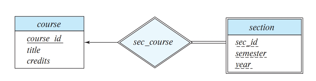 In our example, the identifying entity set for section is course, and the relationship sec_course, which associates section entities with their corresponding course entities, is the identifying relationship. The primary key of section is formed by the primary key of the identifying entity set (that is, course), plus the discriminator of the weak entity set (that is, section). Thus, the primary key is {course id, sec_id, year, semester}.