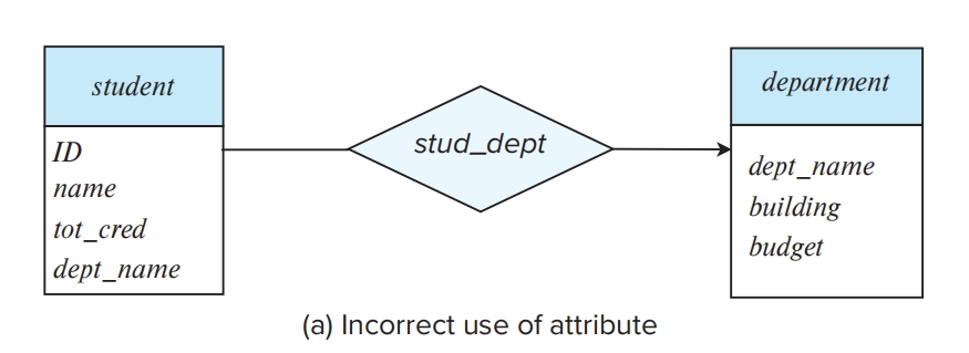 例如,在我们的大学E-R模型中,将 dept_name 作为 student 的属性是不正确的,即使它作为 student 的关系模式中的属性存在。stud_dept 联系是在 E-R 模型中表示此信息的正确方式,因为它可以明确表示 student 和 department 之间的联系,而不是将这种联系隐含在属性中。同时存在 dept_name 属性以及stud_dept联系将导致信息重复。