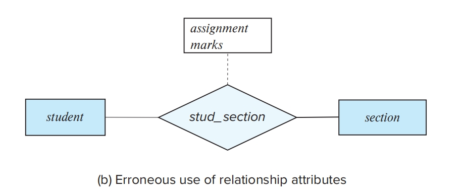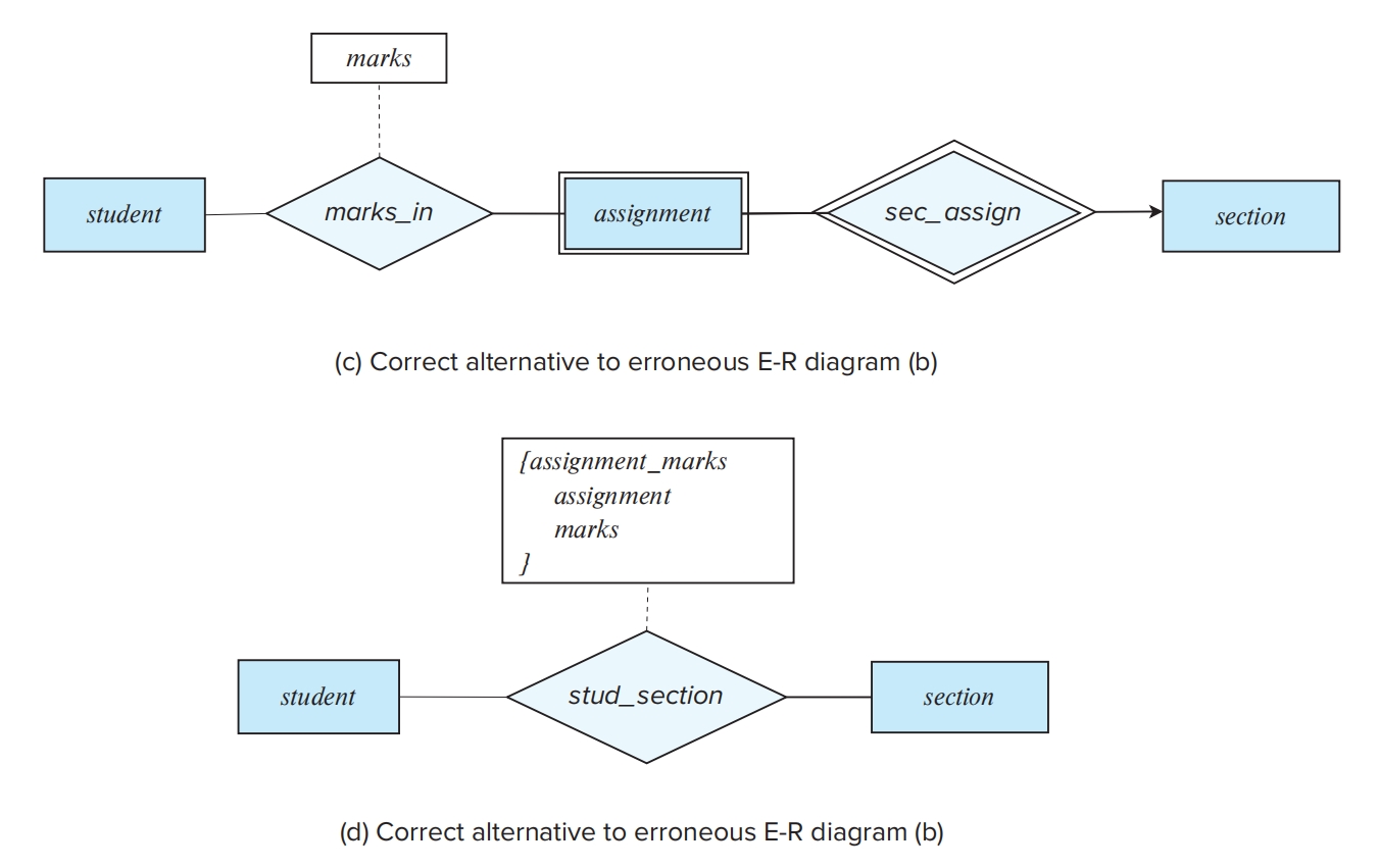 一种解决方案是将 assignment 建模为由 section 标识的弱实体,并在 assignment 和 student 之间添加 marks_in 联系,该联系将具有一个 marks 属性。