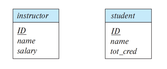 Formally, a relationship set is a mathematical relation on n \(\ge\) 2 (possibly nondistinct) entity sets. If \(E_1, E_2, \ldots, E_n\) are entity sets, then a relationship set R is a subset of \(\{(e_1, e_2, \ldots, e_n) \mid e_i \in E_i\}\) , where \((e_1, e_2, \ldots, e_i)\) is a relationship instance.
