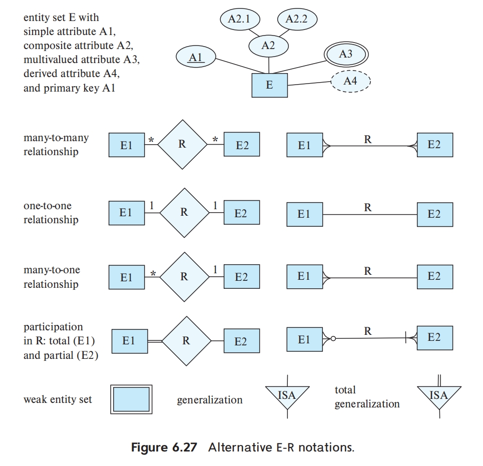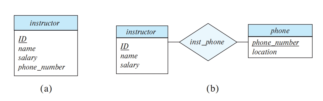 那么,教师的这两种定义之间的主要差别是什么呢?将电话看成一个 phone_number 属性暗示每位教师恰好有一个电话号码。将电话看成一个 phone 实体则允许教师可以有若干电话号码(包括零个)与之相关联。然而,我们还可以简单地将 phone_number 定义为多值属性,从而允许每位教师有多部电话。