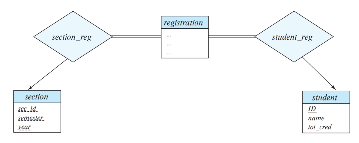 这种设计的问题在于,我们只能表示一个给定的学生-课程段对的单次赋值,因为联系实例必须通过参与实体student和section来唯一标识。