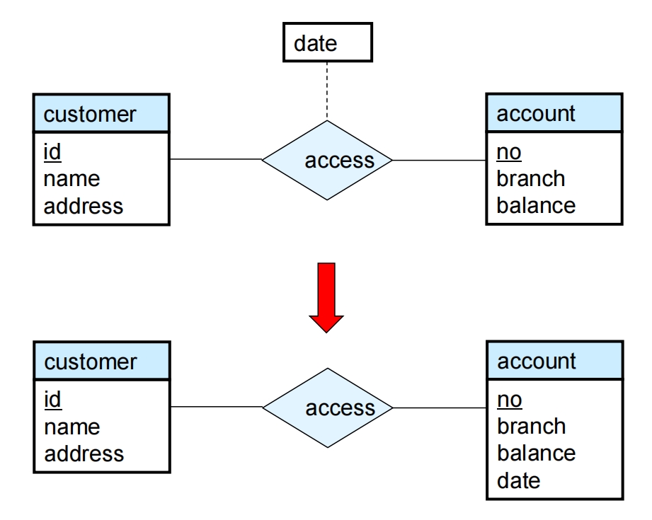 - 在需要多值属性的情况下使用具有单值属性的联系。