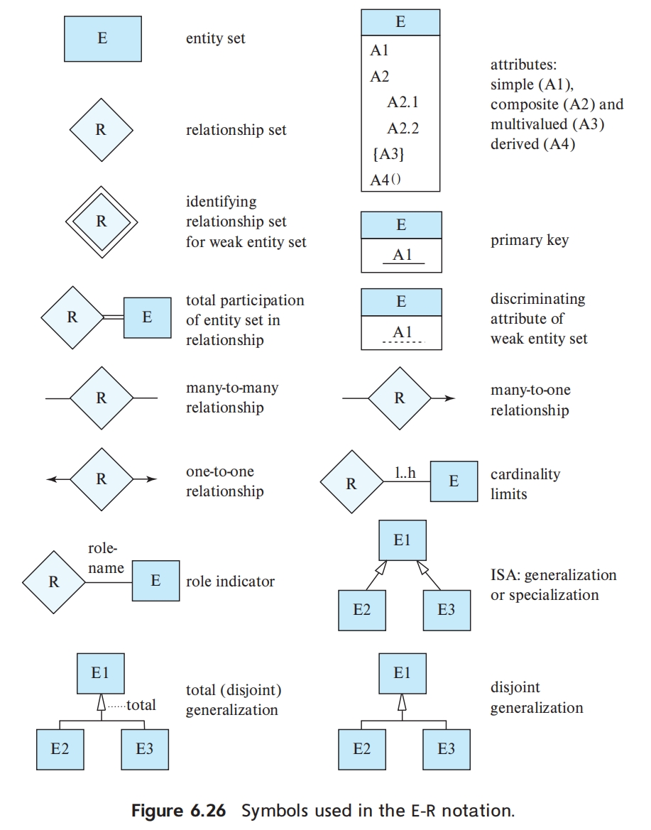 每个弱实体必须和一个标识性实体相关联;也就是说,实体集被称为存在依赖(existence dependent)于标识性实体集。标识性实体集被称为拥有(own)它所标识的弱实体集。将弱实体集与标识性实体集相关联的联系被称为标识性联系(identifying relationship)。标识性联系是从弱实体集到标识性实体集的多对一联系,并且弱实体集在联系中的参与是全部的。标识性联系集不应该有任何描述性属性,因为任何这样的属性都可以与弱实体集相关联。