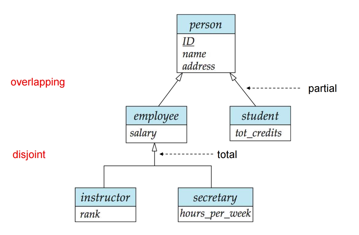 - 对于重叠特化(如 student 和 employee 作为 person 的特化的情况),使用两个单独的箭头。