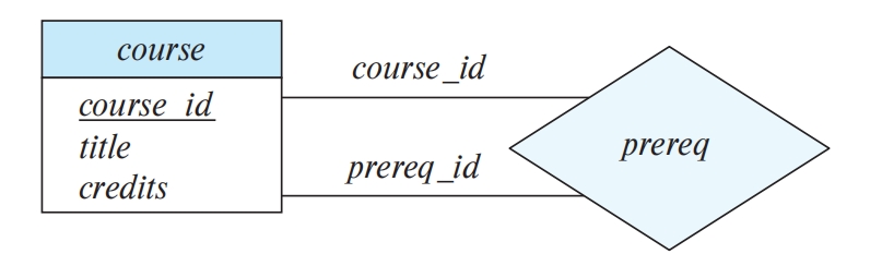 例如,考虑记录大学中所开设的所有课程的信息的 course 实体集。我们用 course 实体的有序对来建模联系集 prereg 以描述一门课程(C2)是另一门课程(C1)的先修课。每对课程中的第一门课程扮演 C1 课程的角色,而第二门课程扮演 C2 先修课的角色。按照这种方式,所有的 prereg 联系通过(C1,C2)对来表示,排除了(C2,C1)对。