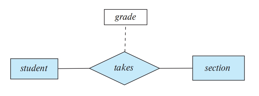 作为联系的描述性属性的示例,考虑与 student 和 section 实体集相关联的 takes 联系集。我们可能希望存储联系的描述性属性 grade ,以记录学生在开设的课程中获得的成绩。