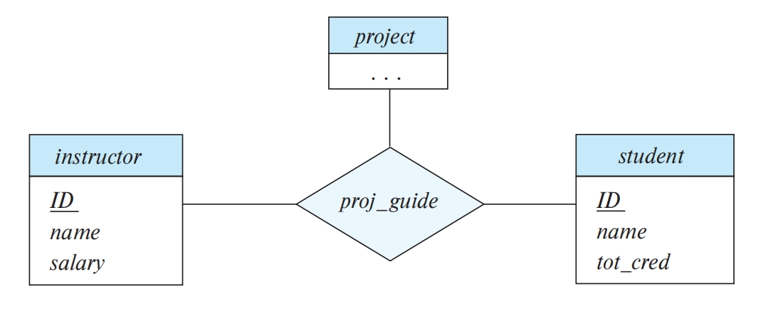然而,有时联系集会涉及多于两个实体集。参与联系集的实体集的数目是联系集的度(degree)。