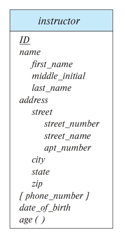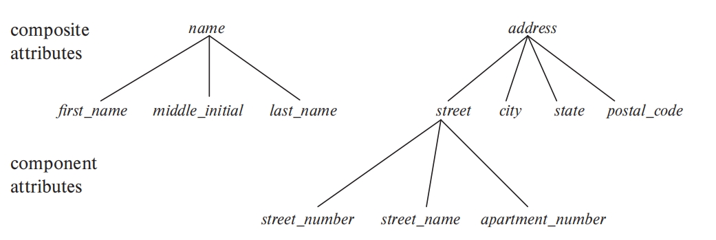 As another example, suppose we were to add an address to the instructor entity set. The address can be defined as the composite attribute address with the attributes street, city, state, and postalcode. The attribute street is itself a composite attribute whose component attributes are street_number, street_name, and apartment_number.