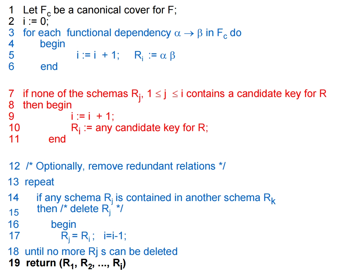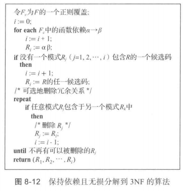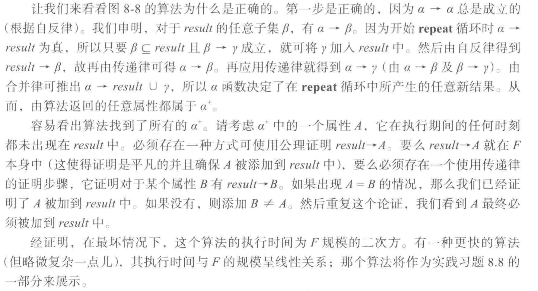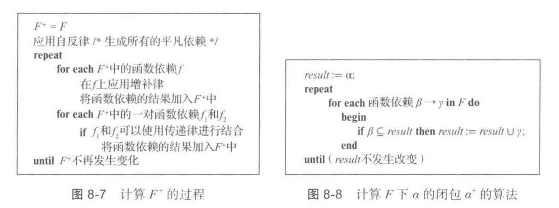- \(F_c\) 中每个函数依赖的左边都是唯一的。也就是说,在 \(F_c\) 中不存在两个函数依赖 \(\alpha_1 \rightarrow \beta_1\) 和 \(\alpha_2 \rightarrow \beta_2\) ,满足 \(\alpha_1 = \alpha_2\) 。