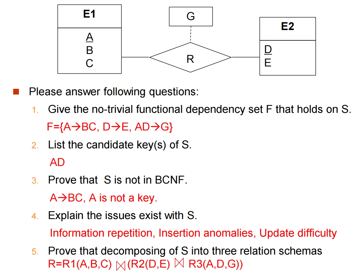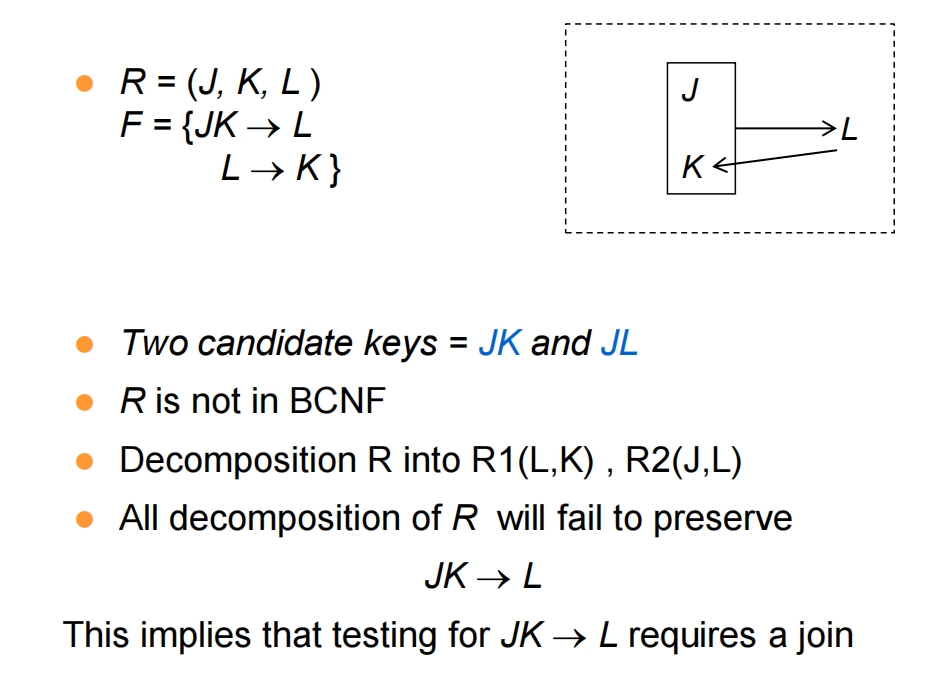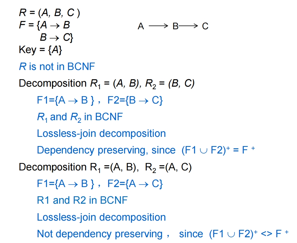 假设我们在一个关系模式上有一个函数依赖集 F 。每当用户在该关系上执行更新时,数据库系统必须确保此更新不破坏任何函数依赖,也就是说,F 中的所有函数依赖在新的数据库状态下仍然被满足。