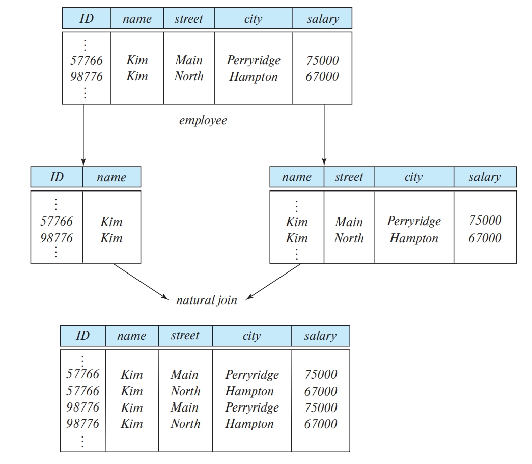 Now consider a less extreme case where we choose to decompose the employee schema : employee (ID, name, street, city, salary), into the following two schemas: employee1 (ID, name) employee2 (name, street, city, salary)