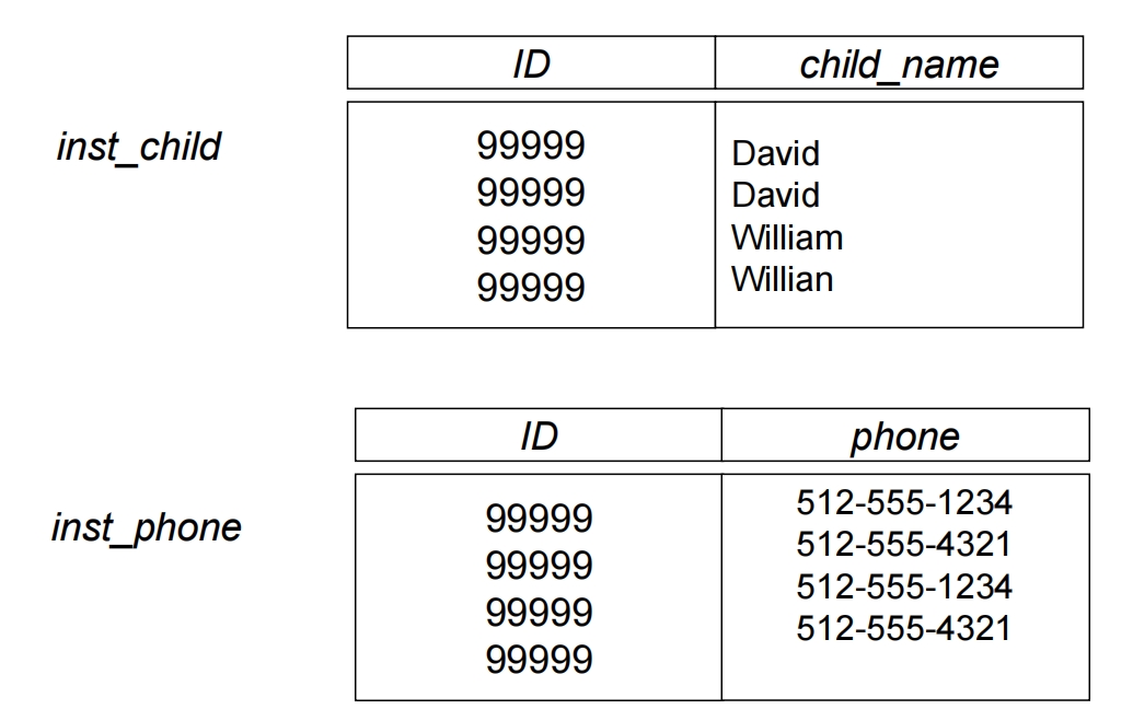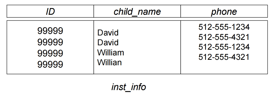 Consider a relation inst_info (\(\underline{ID, child\_name, phone}\)) where an instructor may have more than one phone and can have multiple children.