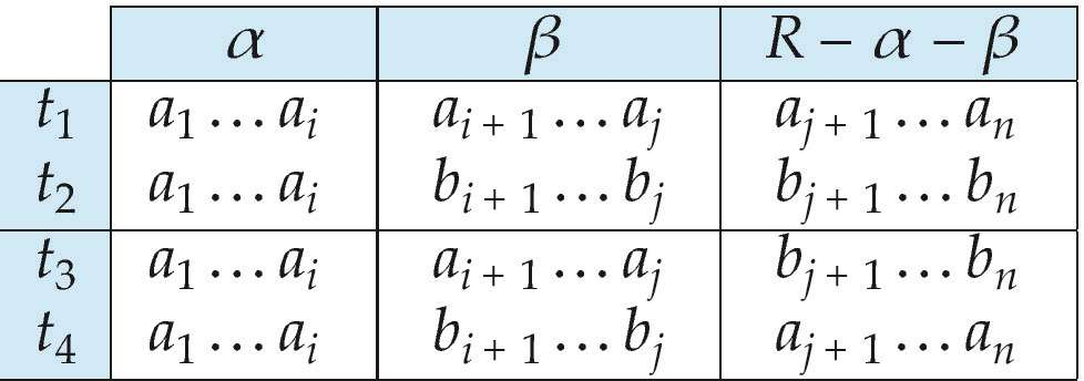 - \(\alpha \rightarrow \rightarrow \beta\) is a trivial (i.e., \(\beta \subseteq \alpha\) or \(\alpha \cup \beta\) = R)