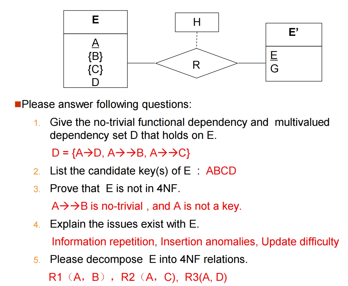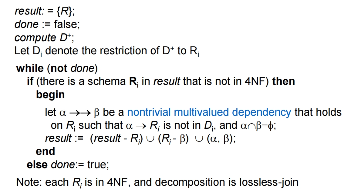 一个关系模式 R 是关于一个函数依赖和多值依赖的集合D的第四范式(Fourth Normal Form,4NF)的条件是,对于 \(D^+\) 中所有形如 \(\alpha \rightarrow \rightarrow \beta\) 的多值依赖(其中 \(\alpha \subseteq R\) 且 \(\beta \subseteq R\) ),至少有以下之一成立: