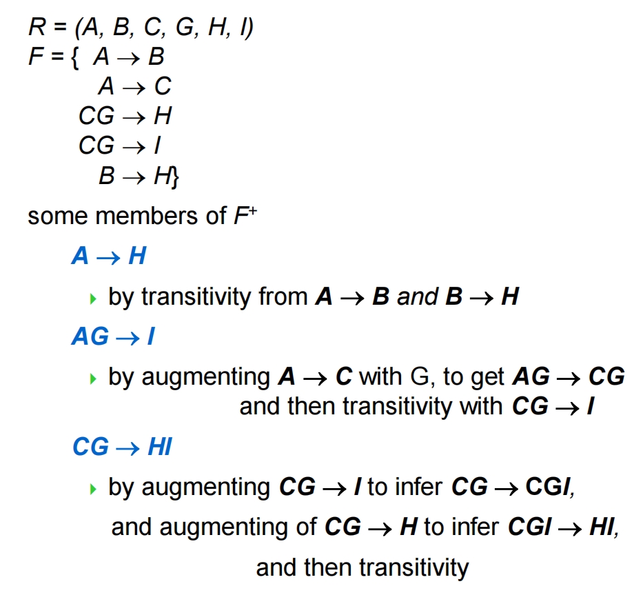 We shall use the notation \(F^+\) to denote the closure of the set F, that is, the set of all functional dependencies that can be inferred given the set F. \(F^+\) contains all of the functional dependencies in F.