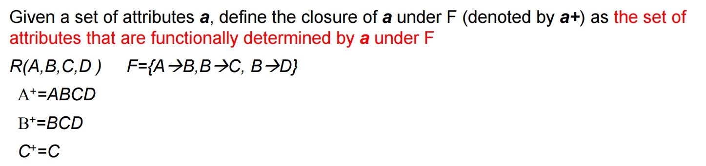 - It gives us an alternative way to compute \(F^+\) : For each \(\gamma \subseteq R\), we find the closure \(\gamma^+\), and for each \(S \subseteq \gamma^+\), we output a functional dependency \(\gamma \rightarrow S\).