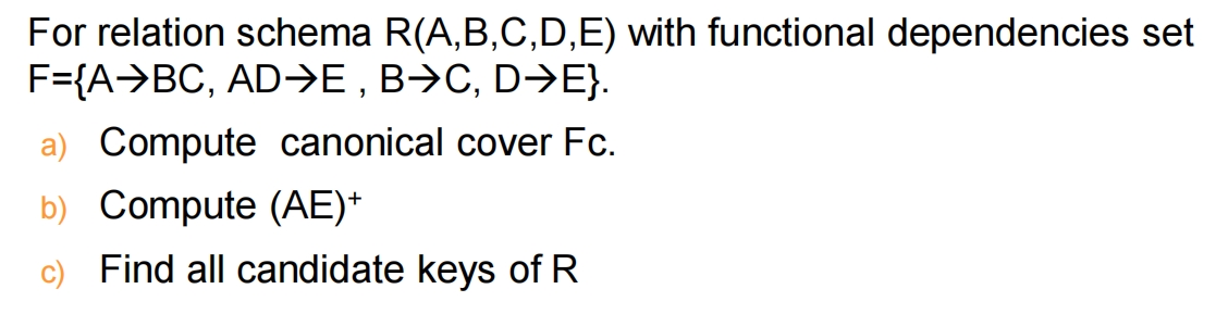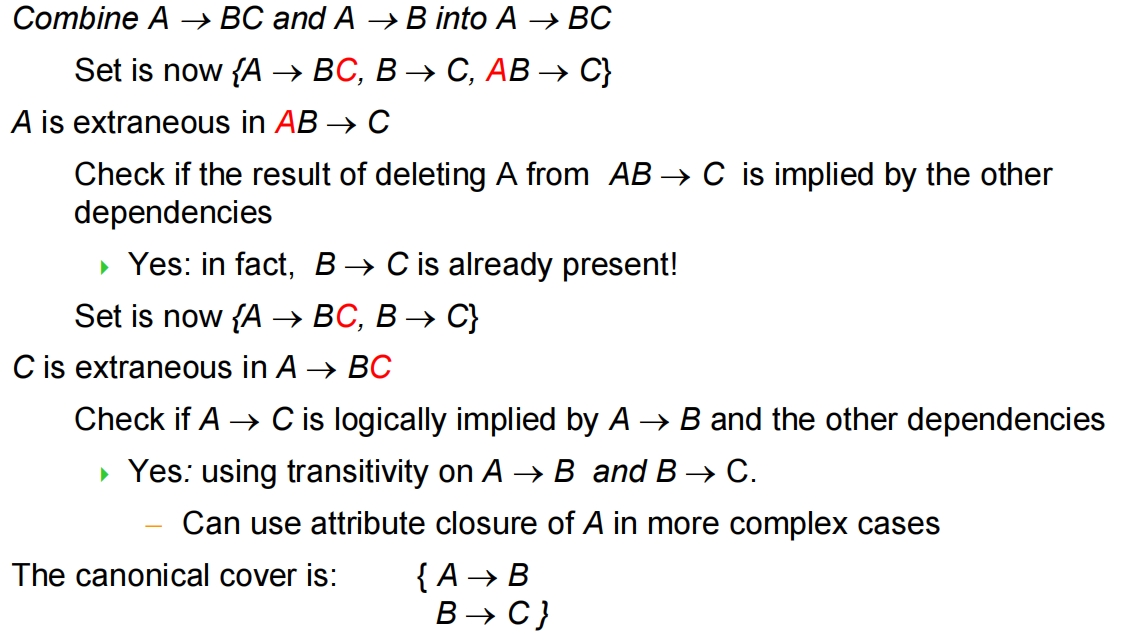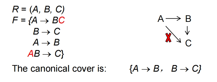 Intuitively, a canonical cover of F is a "minimal" set of functional dependencies equivalent to F, having no redundant dependencies or redundant parts of dependencies.