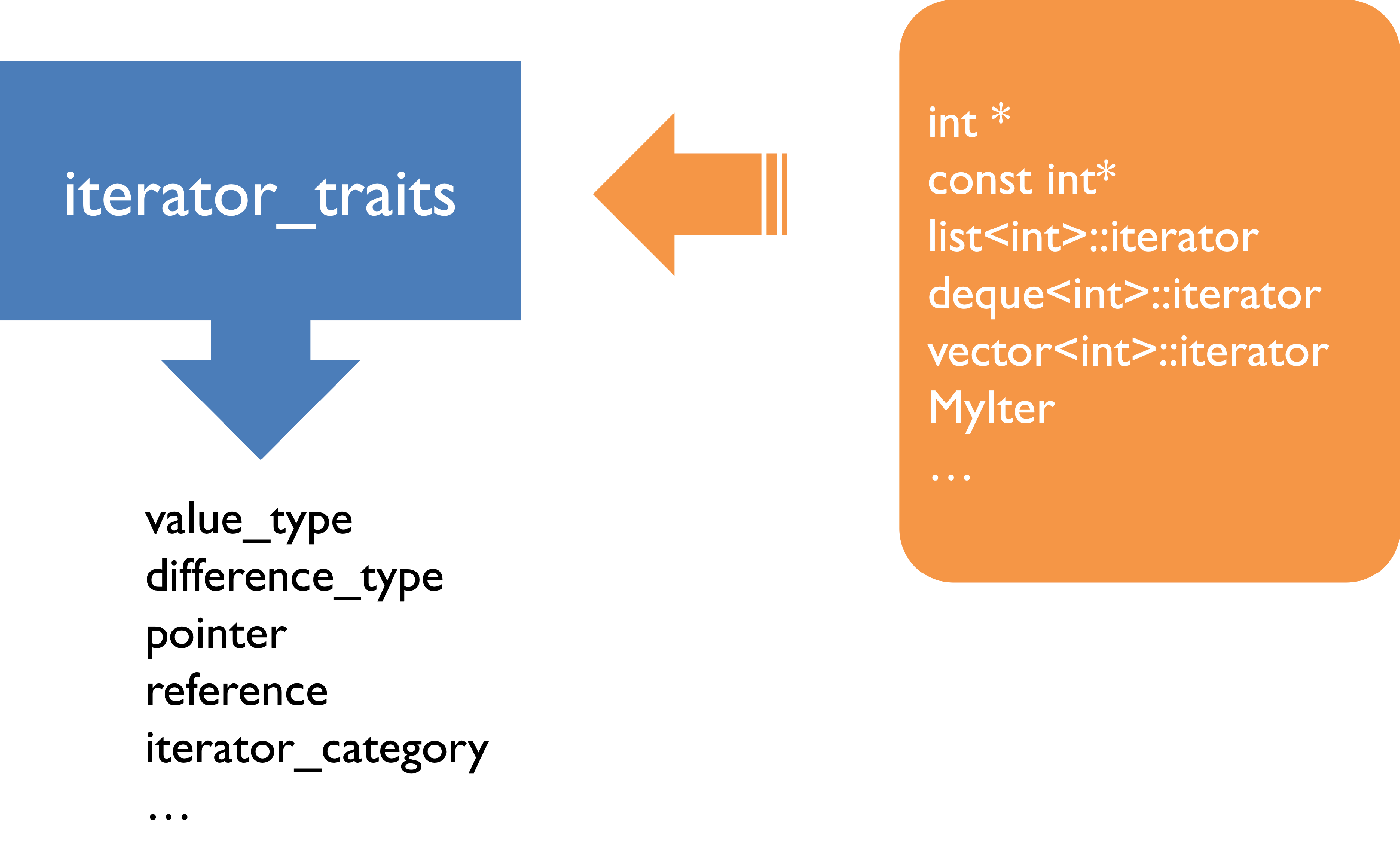 - Traits trick extracts type information embedded in different iterators, including raw pointers.