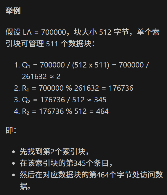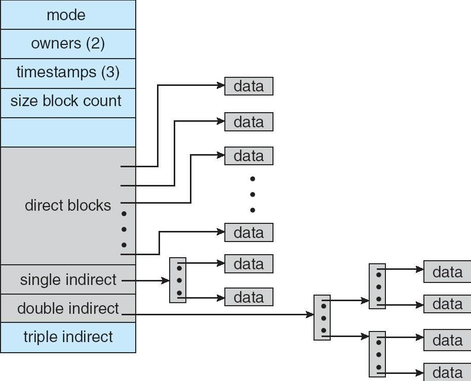 - file data blocks or pointers to file data blocks(文件数据块或指向数据块的指针): 记录文件实际内容存放在磁盘上的位置。可能直接存储数据块编号,也可能是指向数据块的指针(如 inode 结构中的直接、间接块指针)。