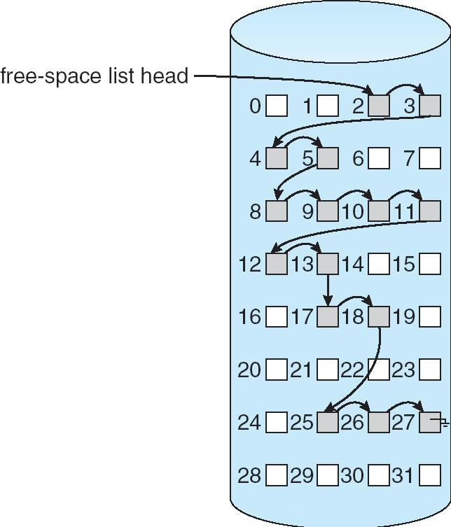 空闲空间信息(如空闲链表指针、位图)必须保存在磁盘上,否则断电或系统崩溃后会丢失。