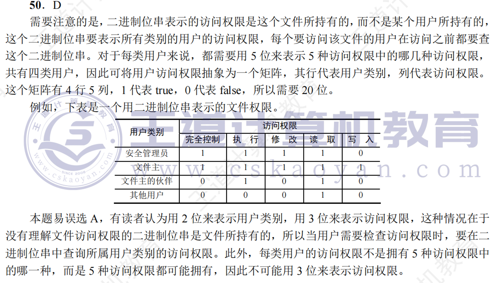 某文件系统中,针对每个文件,用户类别分为4类:安全管理员、文件主、文件主的伙伴、其他用户;访问权限分为5种:完全控制、执行、修改、读取、写入。若文件控制块中用二进制位串表示文件权限,为表示不同类别用户对一个文件的访问权限,则描述文件权限的位数至少应为()。