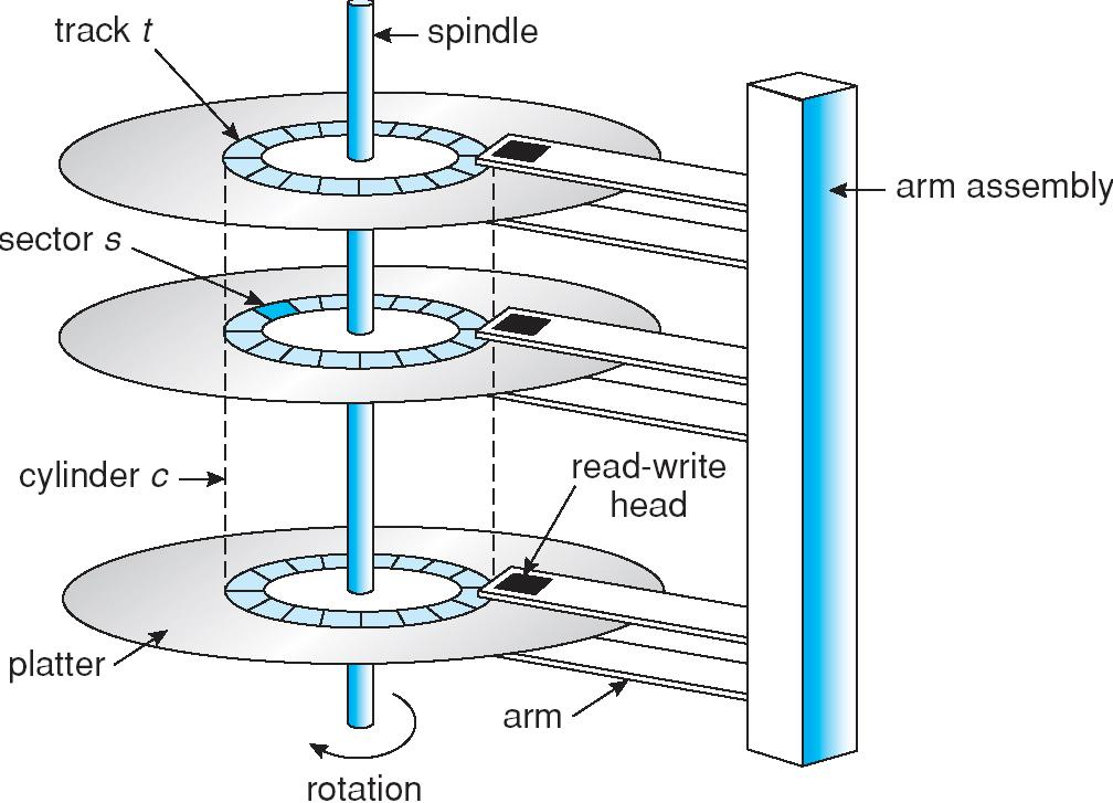 - 多个盘片通过主轴(spindle)串联在一起,主轴带动所有盘片同步旋转。