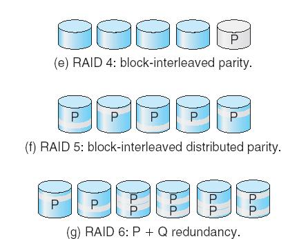 - Block-level Striping – different blocks of a file are striped 把文件的不同块分布到不同磁盘。