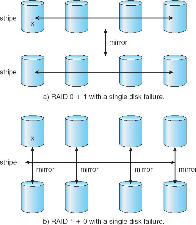 - Mirroring or shadowing keeps duplicate of each disk. 每块磁盘都保留一个副本,数据安全性高,但磁盘利用率低。