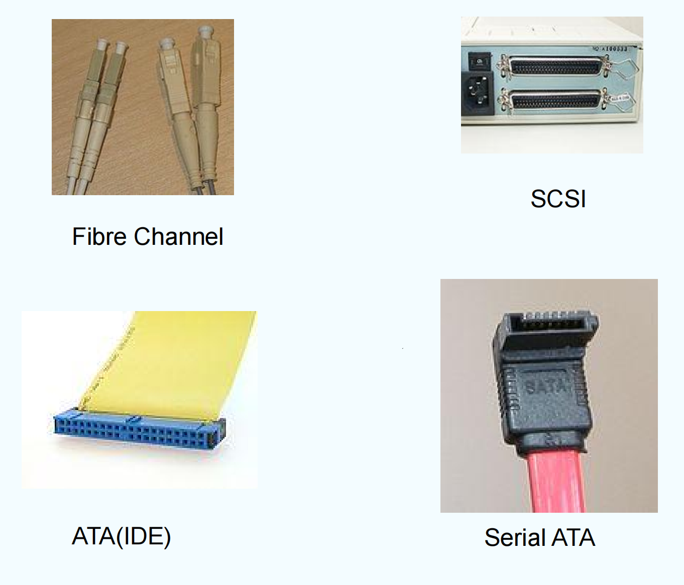 - Buses vary, including EIDE, ATA, SATA, USB, Fiber Channel, SCSI 总线类型多样