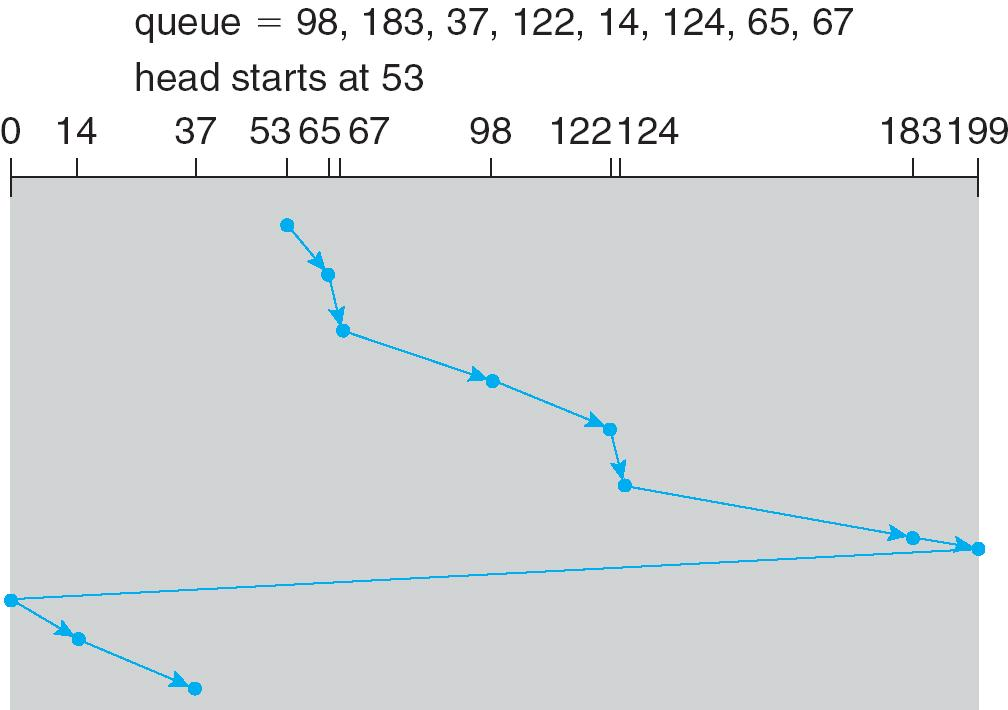 Arm only goes as far as the last request in each direction, then reverses direction immediately, without first going all the way to the end of the disk.