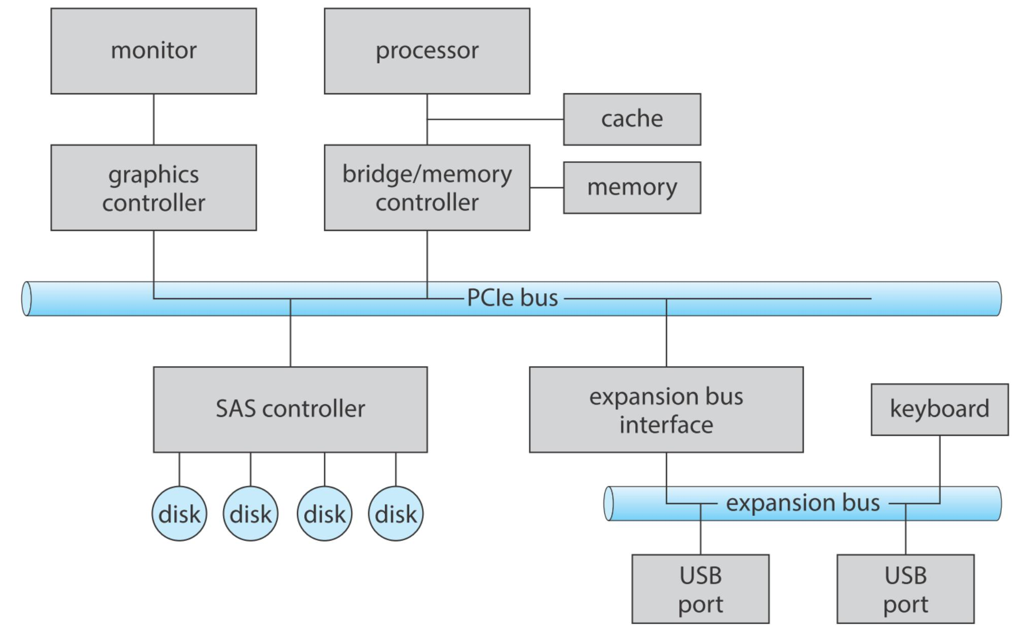 - PCIe bus(PCI Express总线):现代PC的主要高速通信通道,连接CPU、内存、显卡、磁盘控制器等核心部件。所有高速设备都通过PCIe总线与主机通信。