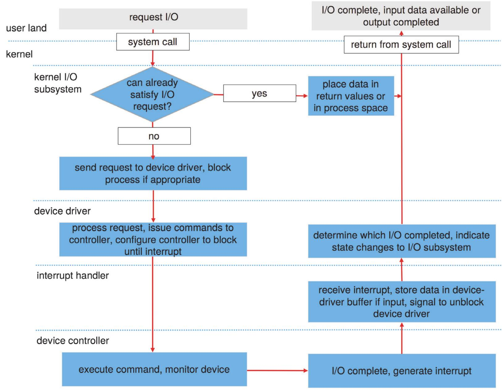 设备驱动确定哪个I/O请求完成,并将状态变化通知内核I/O子系统。
