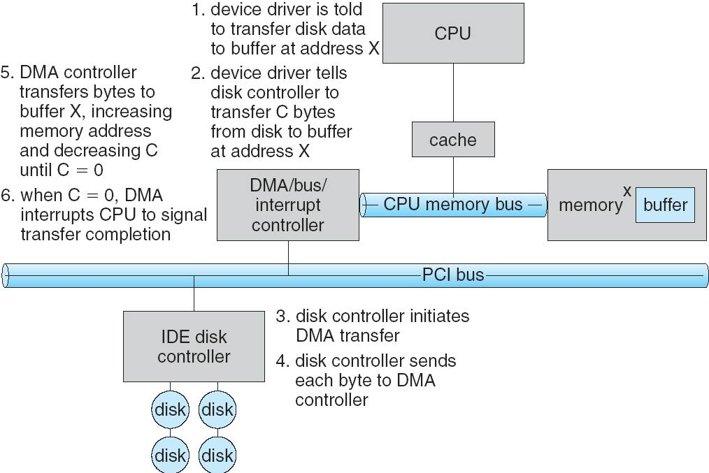 - 控制器清除command-ready位,清除status寄存器中的error位(表示I/O成功),并清除busy位,表示完成操作