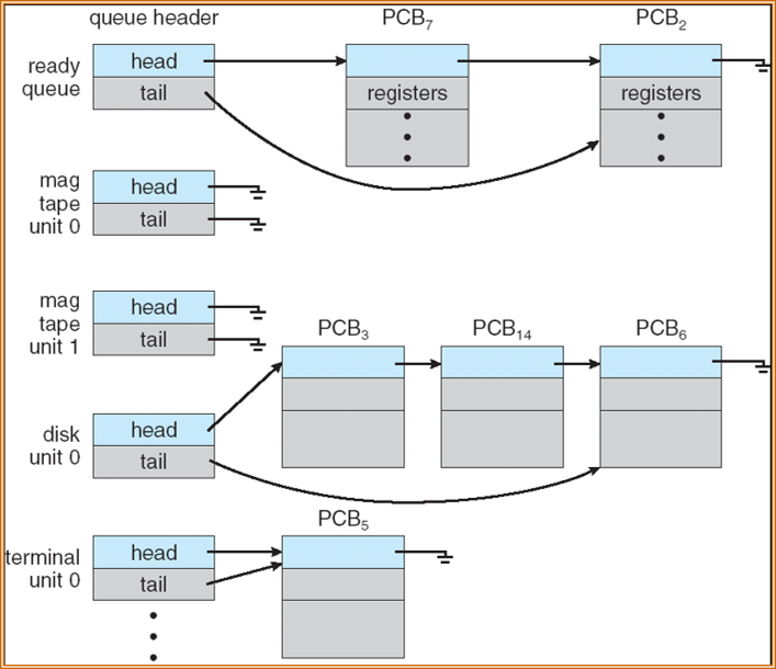 Device queues – set of processes waiting for an I/O device