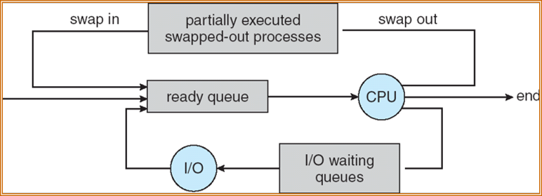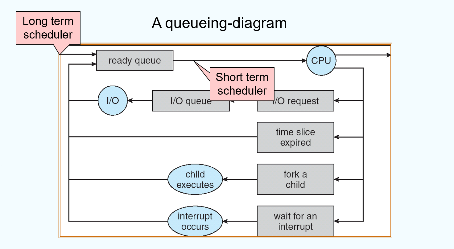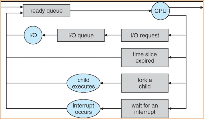 - I/O操作完成后,进程回到 ready queue,等待再次被调度。
