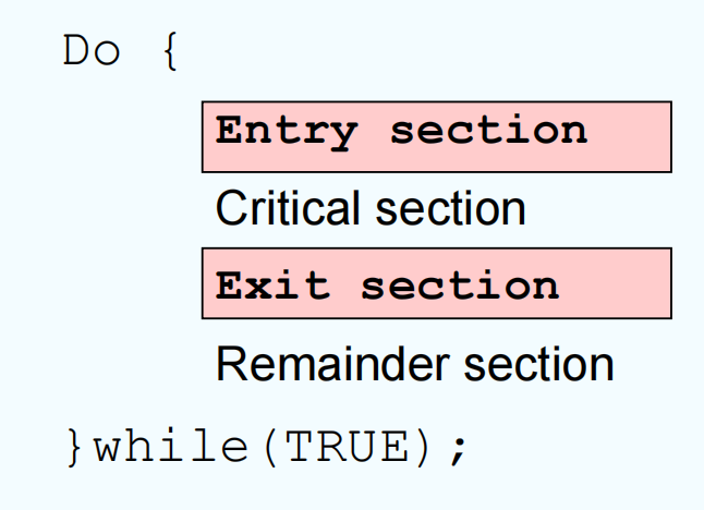 - Mutual Exclusion - If process \(P_i\) is executing in its critical section, then no other processes can be executing in their critical sections