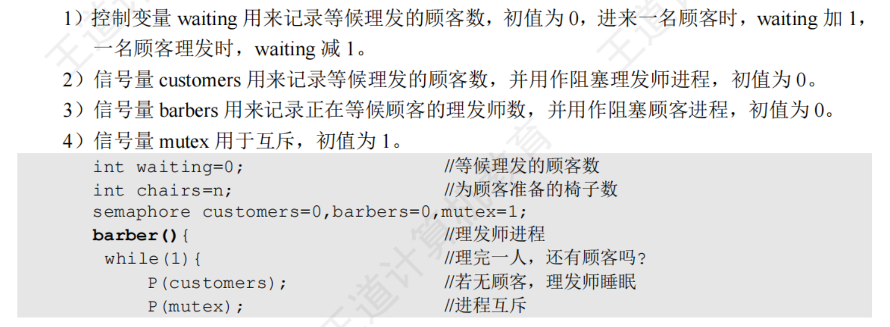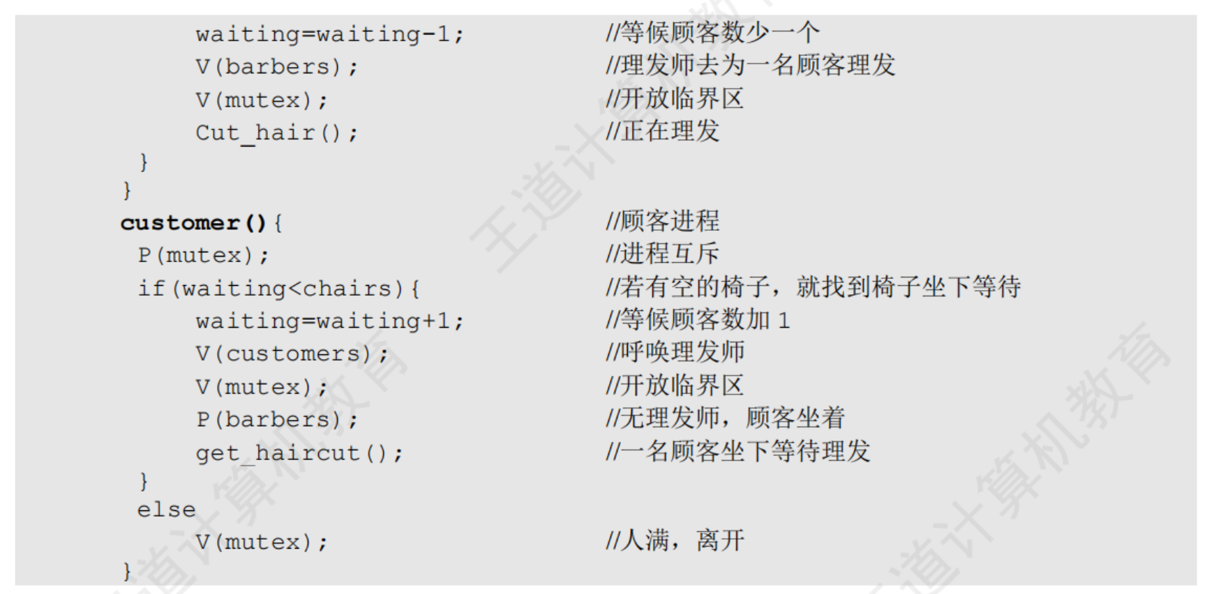 理发店里有一位理发师、一把理发椅和n把供等候理发的顾客坐的椅子。若没有顾客理发师便在理发椅上睡觉,一位顾客到来时,顾客必须叫醒理发师,若理发师正在理发时又有顾客来到,若有空椅子可坐,则坐下来等待,否则就离开。试用PV操作实现并说明信号量的定义和初值。