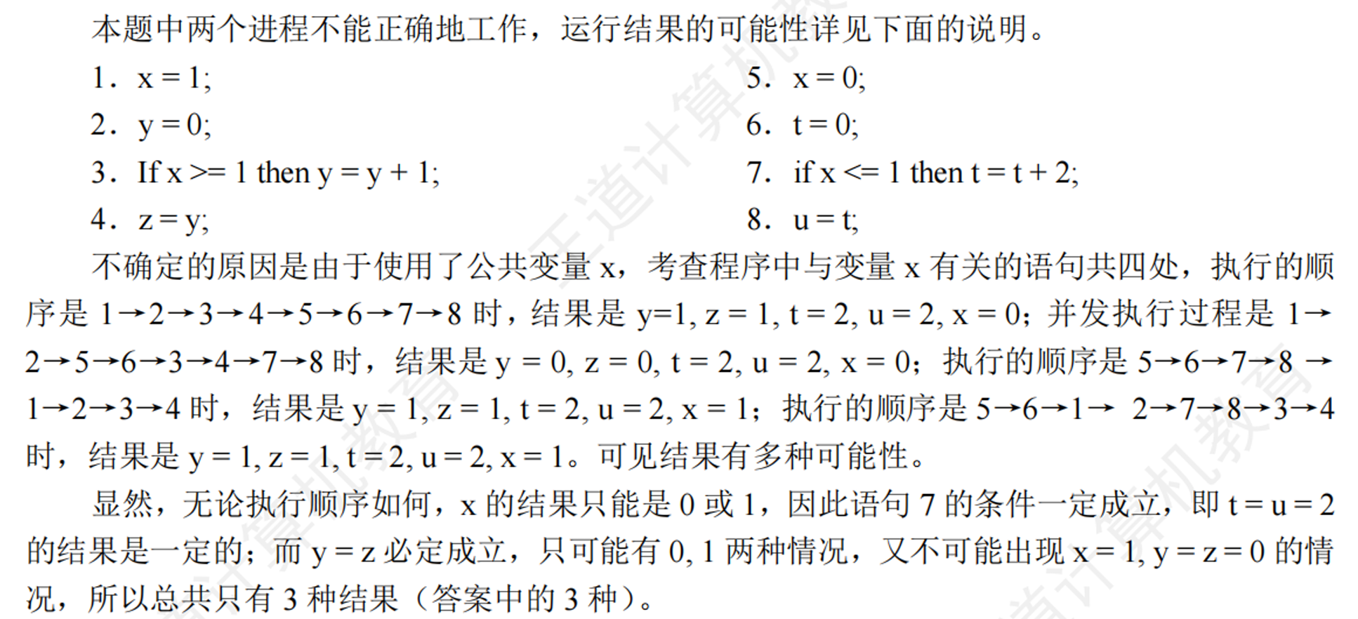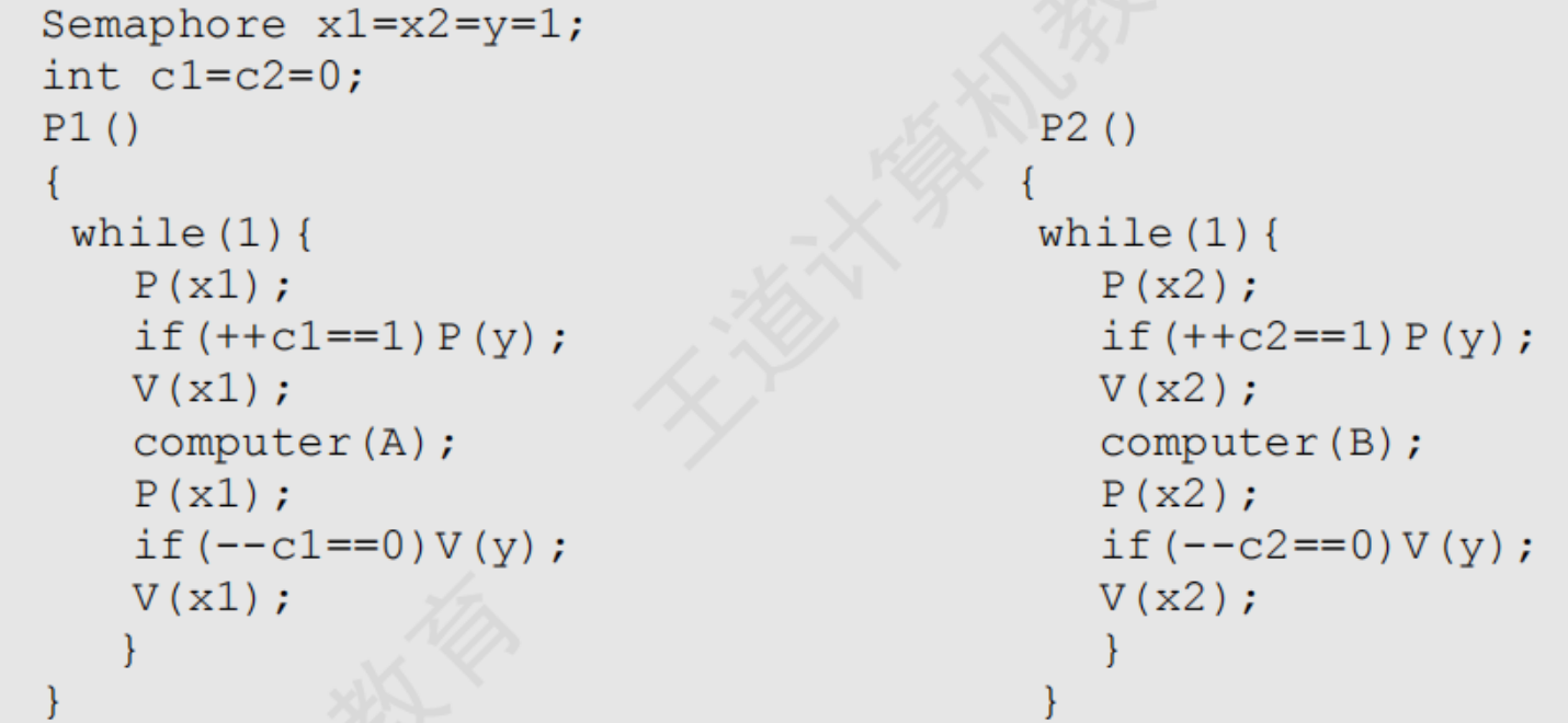 遇到这种问题时千万不要慌张,下面我们来慢慢分析,给读者一个清晰的解题过程:仔细考察程序代码,可以看出这是一个扩展的单行线问题。也就是说,某单行线只允许单方向的车辆通过,在单行线的入口设置信号量 y,在告示牌上显示某一时刻各方向来车的数量 c1 和c2,要修改告示牌上的车辆数量必须互斥进行,为此设置信号量 x1 和 x2。若某方向的车辆需要通过时,则首先要将该方向来车数量 c1或 c2增加 1,并查看自己是否是第一个进入单行线的车辆,若是,则获取单行线的信号量 y,并进入单行线。通过此路段以后出单行线时,将该方向的车辆数 c1 或 c2 减 1(当然是利用 x1 或x2 来互斥修改),并査看自己是否是最后一辆车,若是,则释放单行线的互斥量 y,否则保留信号量 y,让后继车辆继续通过。双方的操作如出一辙。考虑出现一个极端情况,即当某方向的车辆首先占据单行线并后来者络绎不绝时,另一个方向的车辆就再没有机会通过该单行线了。而这种现象是由于算法本身的缺陷造成的,不属于因为特殊序列造成的饥饿,所以它是真正的饥饿现象。因为有信号量的控制,所以死锁的可能性没有了(双方同时进入单行线,在中间相遇,造成双方均无法通过的情景)。