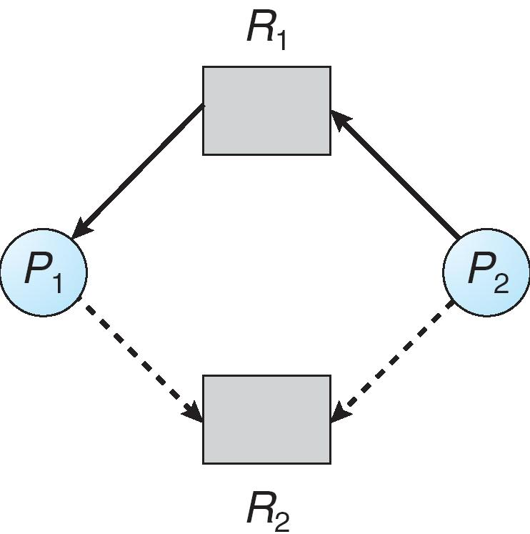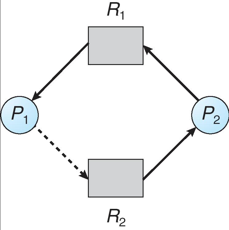 - \(P_1\):持有 \(R_2\) 的一个实例,正在请求 \(R_1\)。