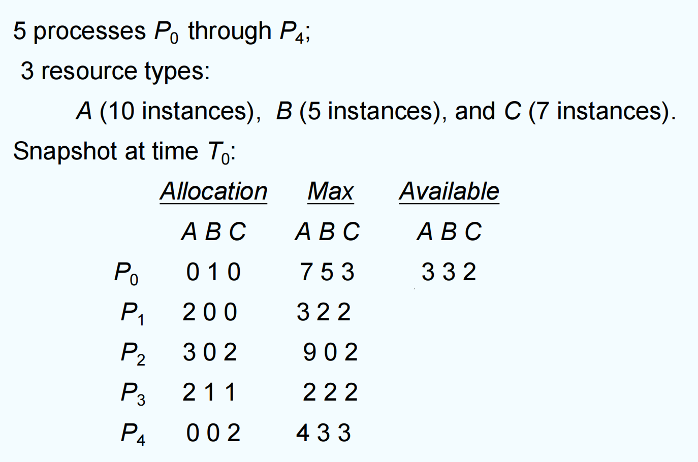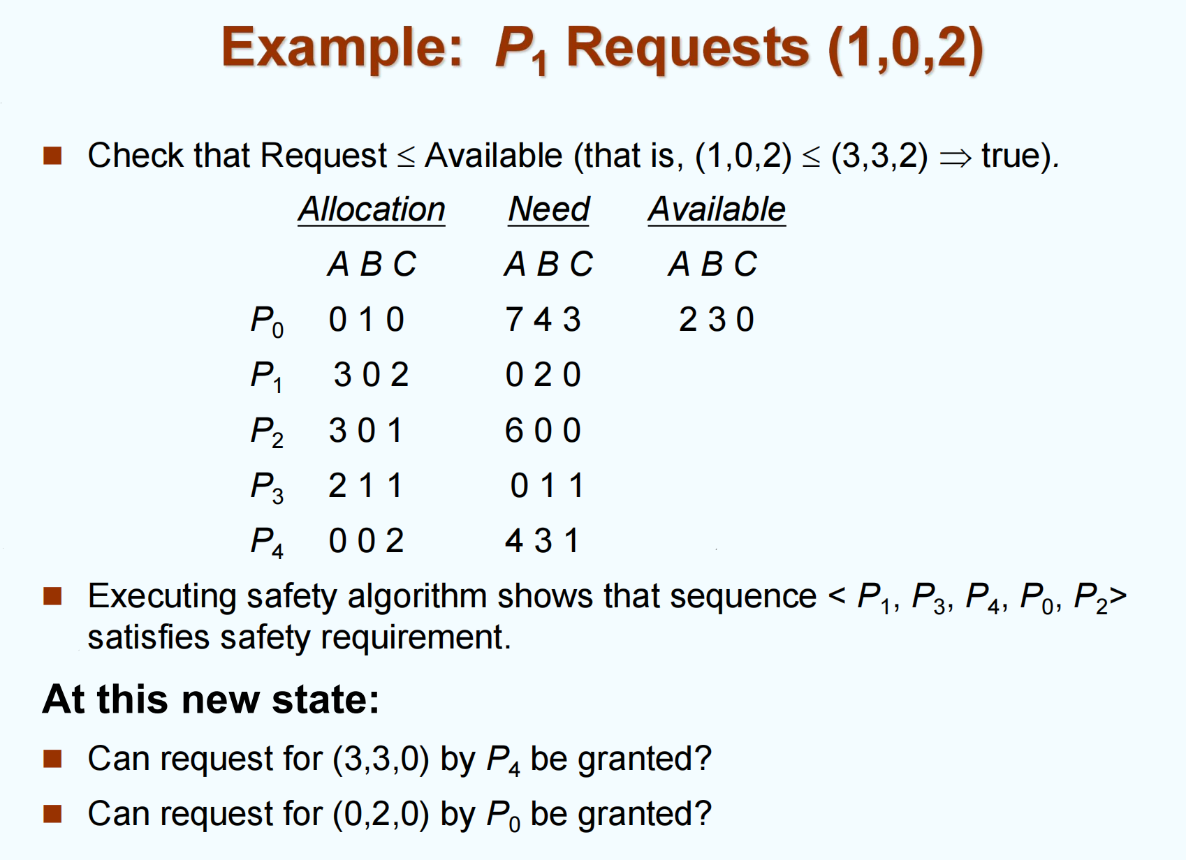 - Available = (2,3,0) – (0,2,0) = (2,1,0)