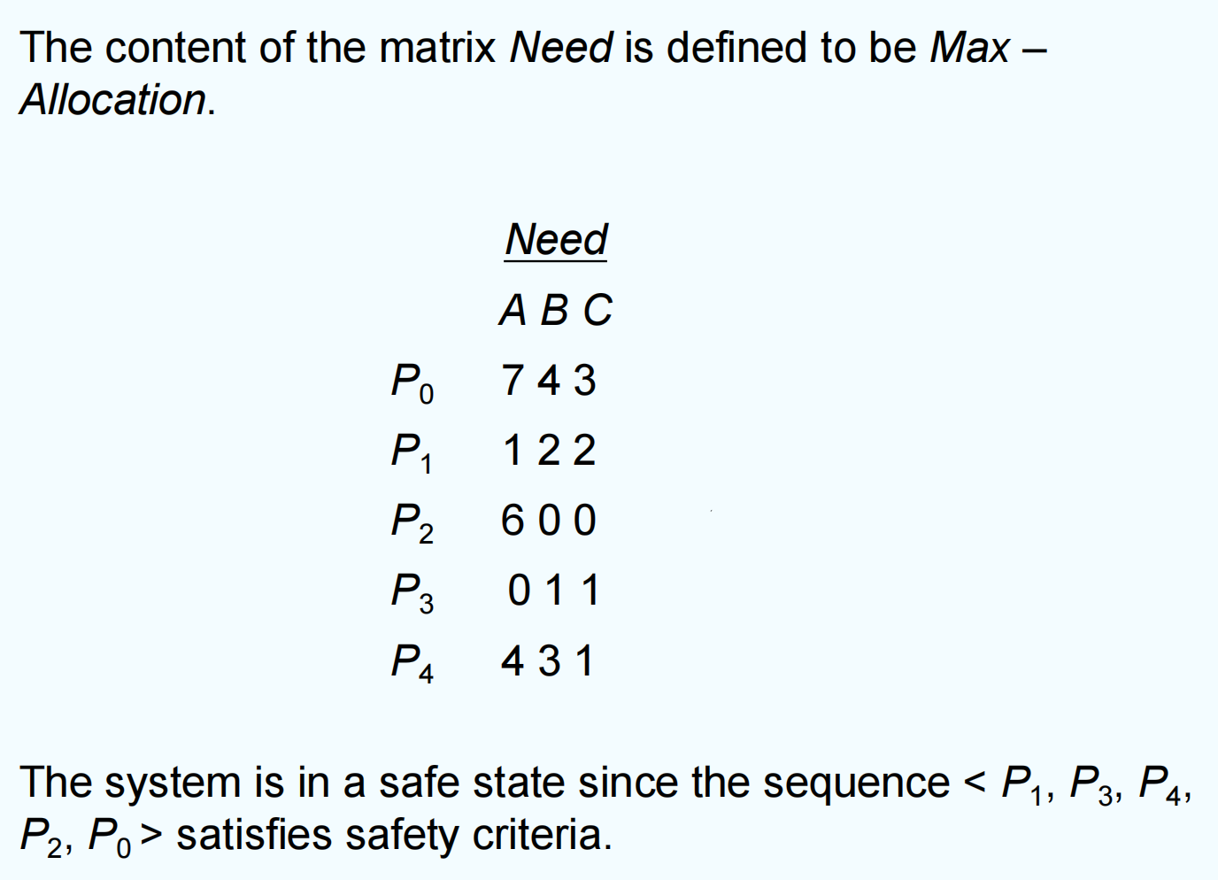 - Allocation[0] = (0,1,0) + (0,2,0) = (0,3,0), Need[0] = (7,4,3) – (0,3,0) = (7,1,3)