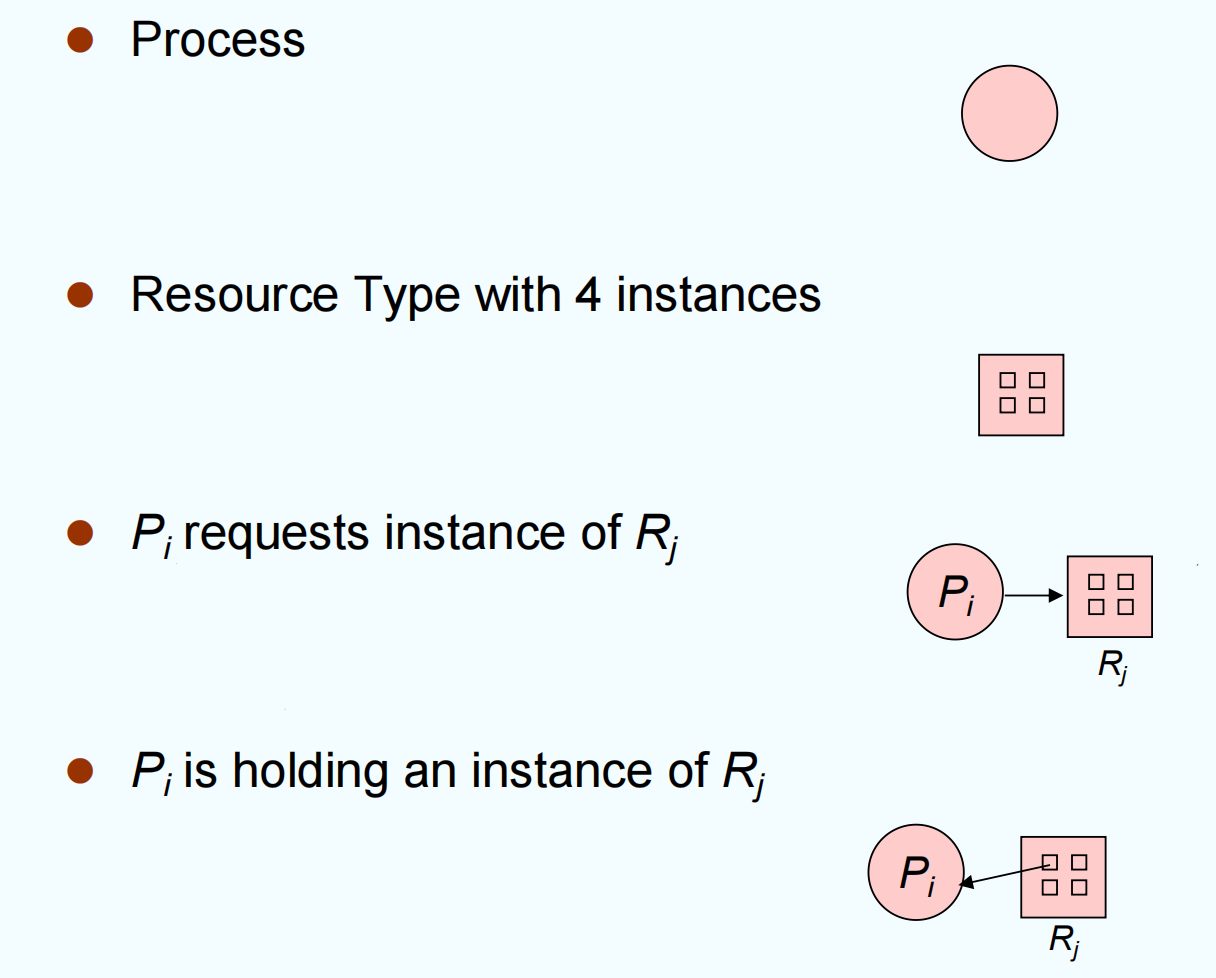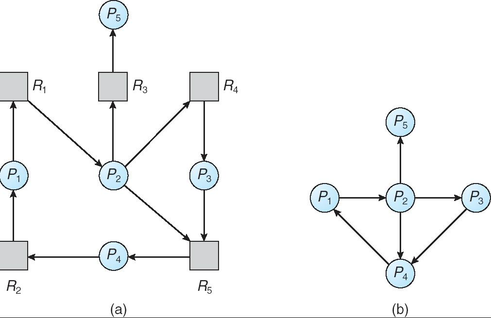 - \(P_i \to P_j\) if \(P_i\) is waiting for \(P_j\). 如果 \(P_i\) 正在等待 \(P_j\) 释放资源,则有一条 \(P_i \Rightarrow P_j\) 的有向边。