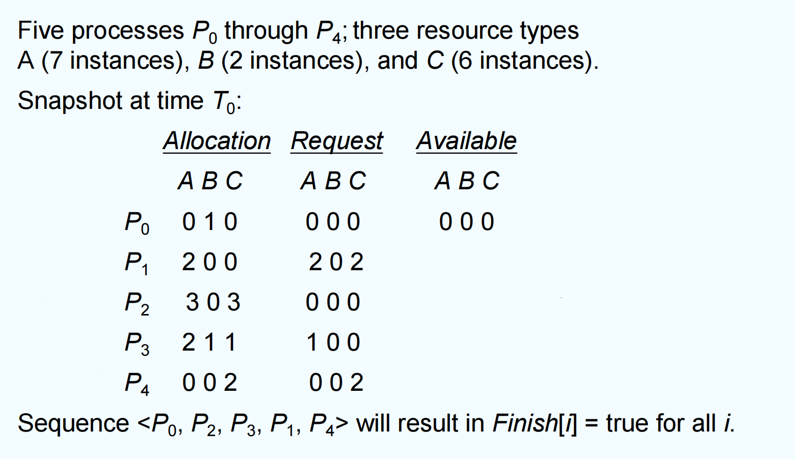 - For i = 1,2, …, n, if \(Allocation_i \neq\) 0, then Finish[i] = false; otherwise, Finish[i] = true.