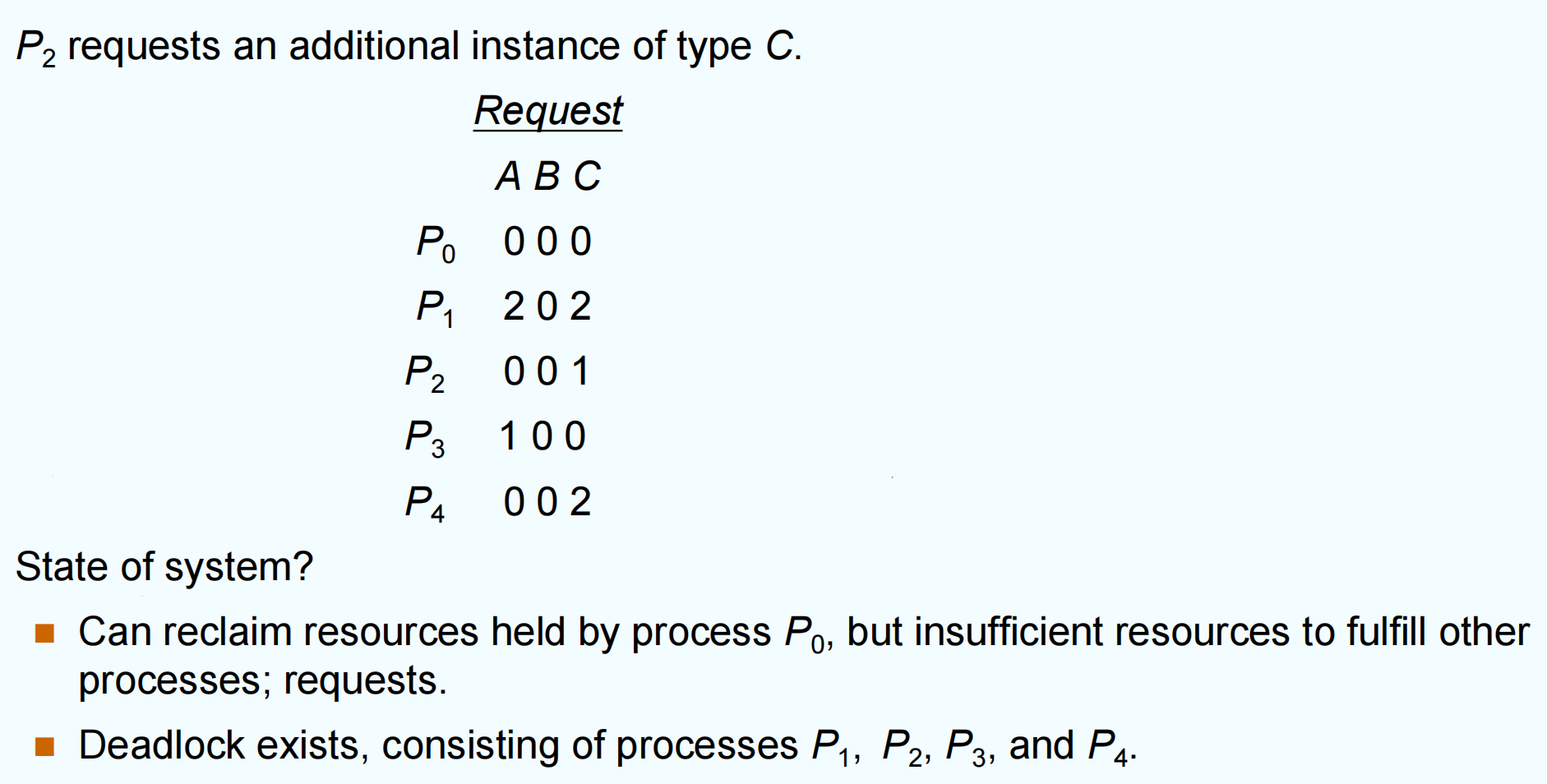 \(P_2\) 请求一个额外的 C 型资源后,系统进入死锁状态。\(P_1\) , \(P_2\) , \(P_3\) , \(P_4\) 均无法完成。