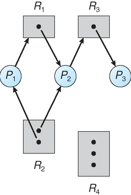 - \(P_4\) 持有 \(R_2\) 的一个实例,且没有请求其他资源。它大概率会运行结束并释放 \(R_2\)。